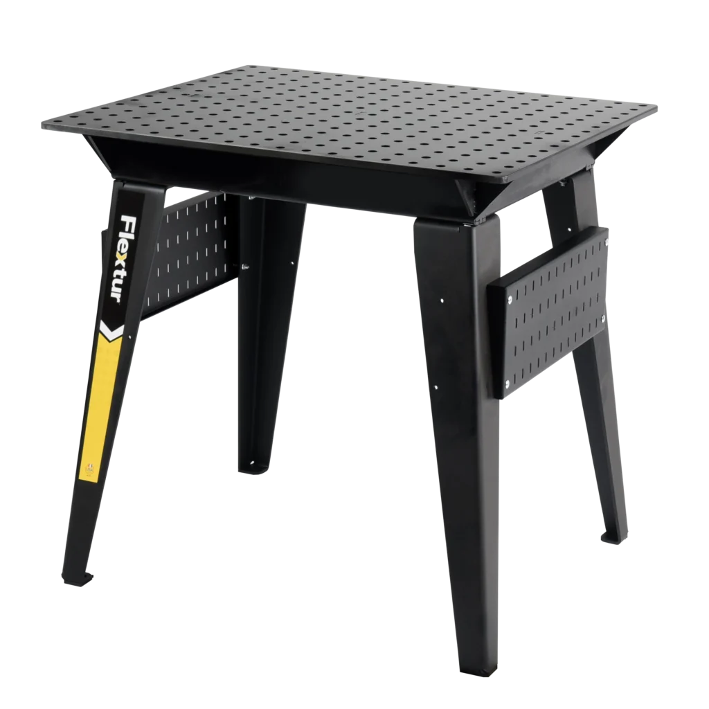 Flextur™ Nitride Welding Table 36″L x 30″W x 35″H, 1/2″ black top with 1/4″ x 2″ struts and a heavy powder-coated matte black base giving it a 1,000lb weight capacity. Surface flatness is +/- .015″ over 4 square feet. The dual-layer protection of nitride & black oxide is a powerful combination. Both harden and prevent corrosion, extending the life of your table – while maintaining flatness and structural integrity. Ideal for smaller jobs or in addition to other Flextur Welding Tables. Use with Flextur Welding Fixturing Kits and Accessories. Comes with Flextur’s industrial 14-gauge steel / metal pegboard / tool board panels that can be used with Flextur accessories. Change over is easy and quick with a 2″ grid pattern of 16mm locator pin holes. Inexperienced Welders can easily make an accurate setup and become productive in minutes with this Welding Table. Onboard metal tool board panels keep tools organized and within easy reach. A complete line of Flextur accessories, ordered separately, are available to outfit your table. Base requires some assembly but all welding table tops ship assembled. American Made in Dalton, Ohio U.S.A.