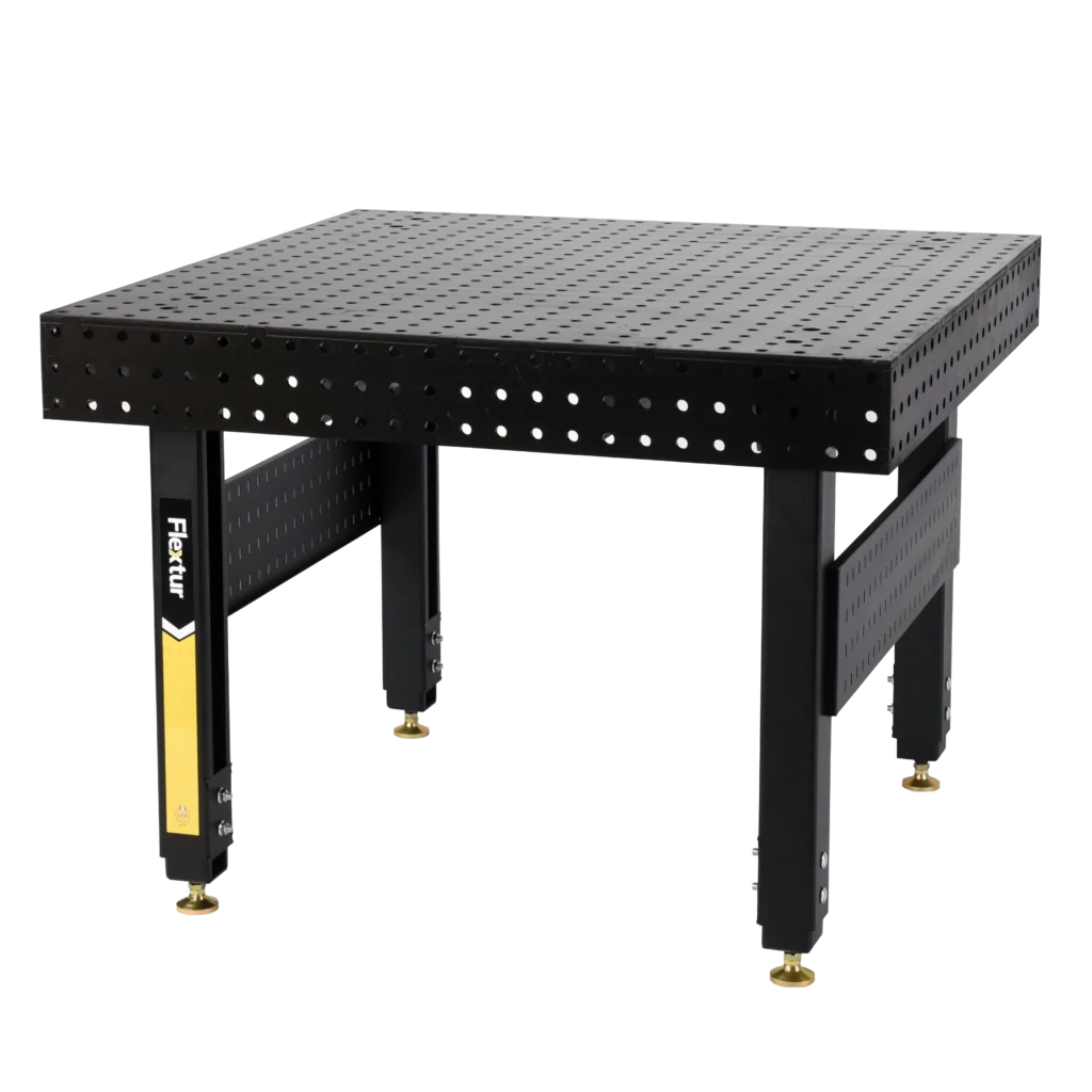 Flextur™ Nitride Welding Table 48″L x 48″W x 35″ to 41″H, with 1/2″ black top supported by 3/8″ x 5″ struts every 16″, Flextur tool board panels, adjustable legs from 35″ to 41″ high, and a 6,000lbs. capacity. Surface flatness is +/- .015″ over 4 square feet. The dual-layer protection of nitride & black oxide is a powerful combination. Both harden and prevent corrosion, extending the life of your table – while maintaining flatness and structural integrity. Change over is easy and quick with movable 16mm locator pin in a 2″ grid pattern. Skirting along all sides has the same hole configuration and gives the flexibility to extend your table in any direction, up to 24″, with a Flextur Fixture Block for larger weldments. The dual-layer protection of nitride & black oxide is a powerful combination. Both harden and prevent corrosion, extending the life of your table – while maintaining flatness and structural integrity. Well suited for larger jobs Flextur Welding Tables will improve accuracy and greatly reduce set up time for complicated Weldments. Inexperienced Welders can easily make an accurate setup and become productive in minutes with this Welding Table. Onboard metal tool board panels keep tools organized and within easy reach. Base requires assembly but all welding table tops ship assembled. A complete line of Flextur Gridlok Accessories, ordered separately, are available to outfit your table. American Made in Dalton, Ohio U.S.A.