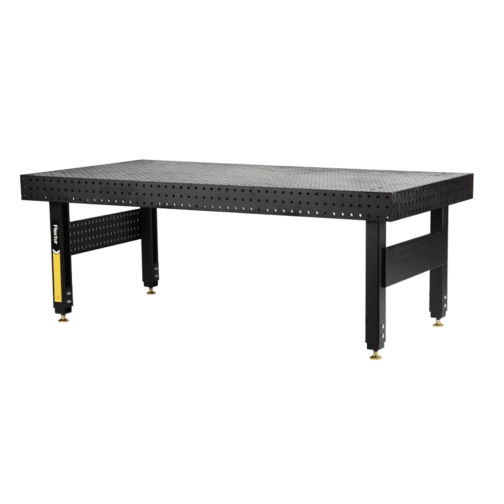 Flextur™ Nitride Welding Table 48″L x 96″W x 35″ to 41″H, with 1/2″ black top supported by 3/8″ x 5″ struts every 16″, Flextur tool board panels, adjustable legs from 35″ to 41″ high, and a 6,000lbs. capacity. Surface flatness is +/- .015″ over 4 square feet. The dual-layer protection of nitride & black oxide is a powerful combination. Both harden and prevent corrosion, extending the life of your table – while maintaining flatness and structural integrity. Change over is easy and quick with movable 16mm locator pin in a 2″ grid pattern. Skirting along all sides has the same hole configuration and gives the flexibility to extend your table in any direction, up to 24″, with a Flextur Fixture Block for larger Weldments. Well suited for larger jobs Flextur Welding Tables will improve accuracy and greatly reduce set up time for complicated Weldments. Inexperienced Welders can easily make an accurate setup and become productive in minutes with this Welding Table. Onboard metal tool board panels keep tools organized and within easy reach. Base requires assembly but all welding table tops ship assembled. A complete line of Flextur Accessories, ordered separately, are available to outfit your table. American Made in Dalton, Ohio U.S.A.