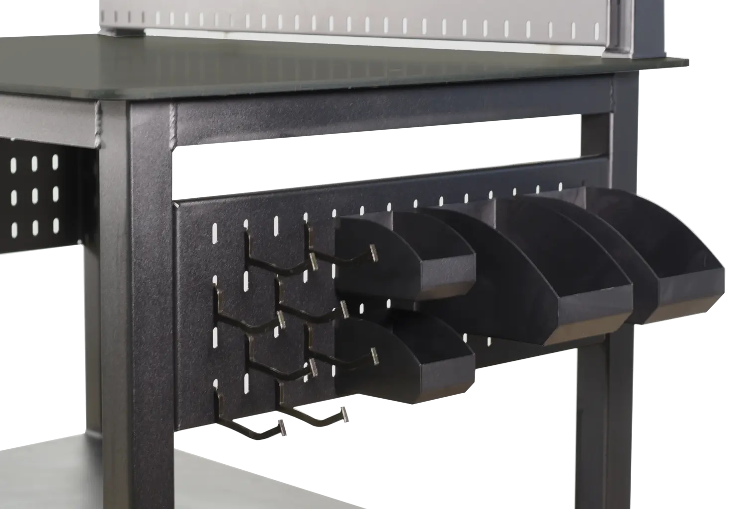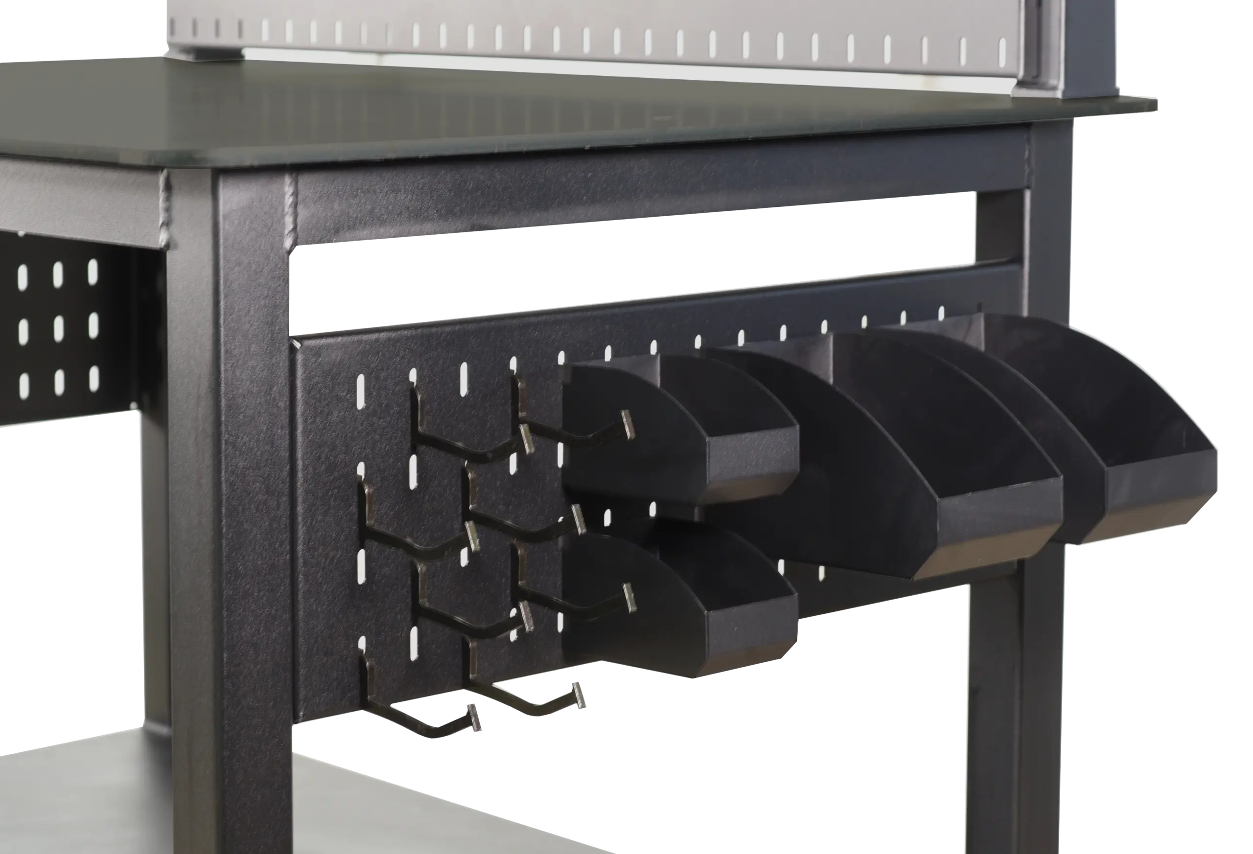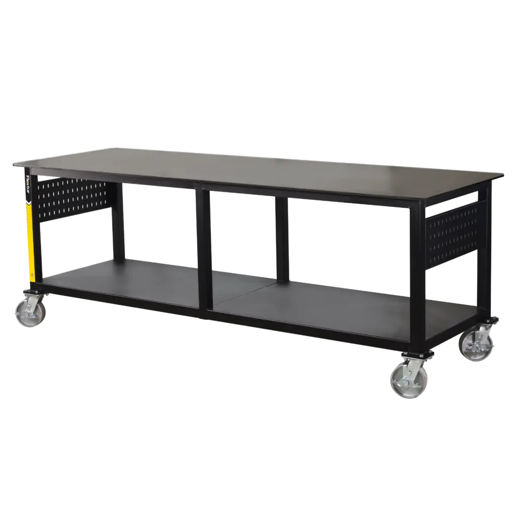 Flextur 96″W x 32″D x 35″H Workbench – This heavy duty Flextur Workbench features a durable, unfinished 3/8” steel top. Flextur 32″D Workbenches are pre-drilled for a 6″ Vise and come equipped with heavy-duty, swiveling lockable 2”W x 6”H casters. A full bottom shelf and Flextur Metal Pegboard / Tool Board Panels are included to keep tools organized along the side of the bench. Additional Flextur Tool Board Panels are available with the 96″ x 36″ Workbench Tool Board Kit. A complete line of Flextur Tool Board Accessories – available separately or in kits – allows for full customization. American Made in Dalton, Ohio U.S.A.
