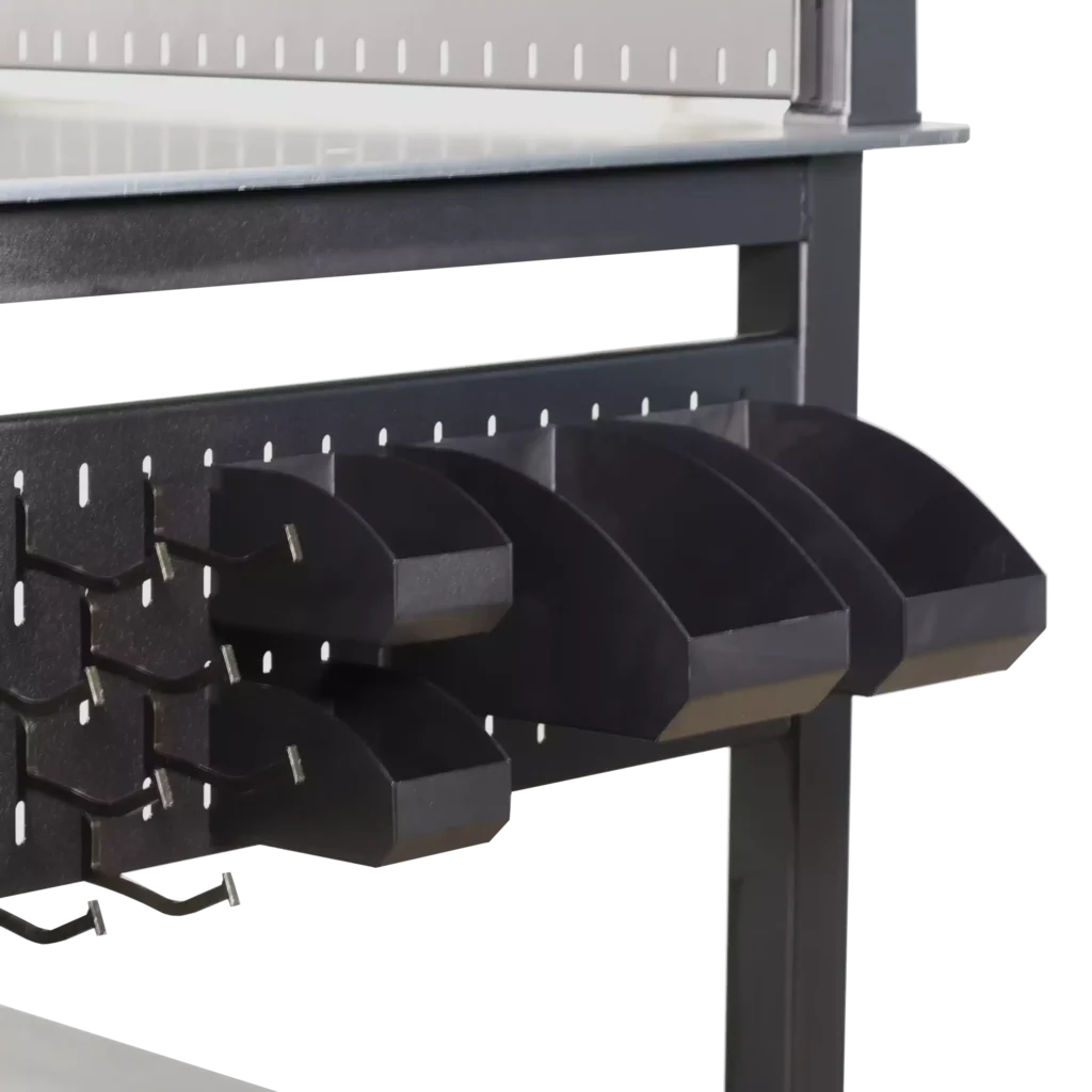 Flextur 96″W x 32″D x 35″H Workbench – This heavy duty Flextur Workbench features a durable, unfinished 3/8” steel top. Flextur 32″D Workbenches are pre-drilled for a 6″ Vise and come equipped with heavy-duty, swiveling lockable 2”W x 6”H casters. A full bottom shelf and Flextur Metal Pegboard / Tool Board Panels are included to keep tools organized along the side of the bench. Additional Flextur Tool Board Panels are available with the 96″ x 36″ Workbench Tool Board Kit. A complete line of Flextur Tool Board Accessories – available separately or in kits – allows for full customization. American Made in Dalton, Ohio U.S.A.