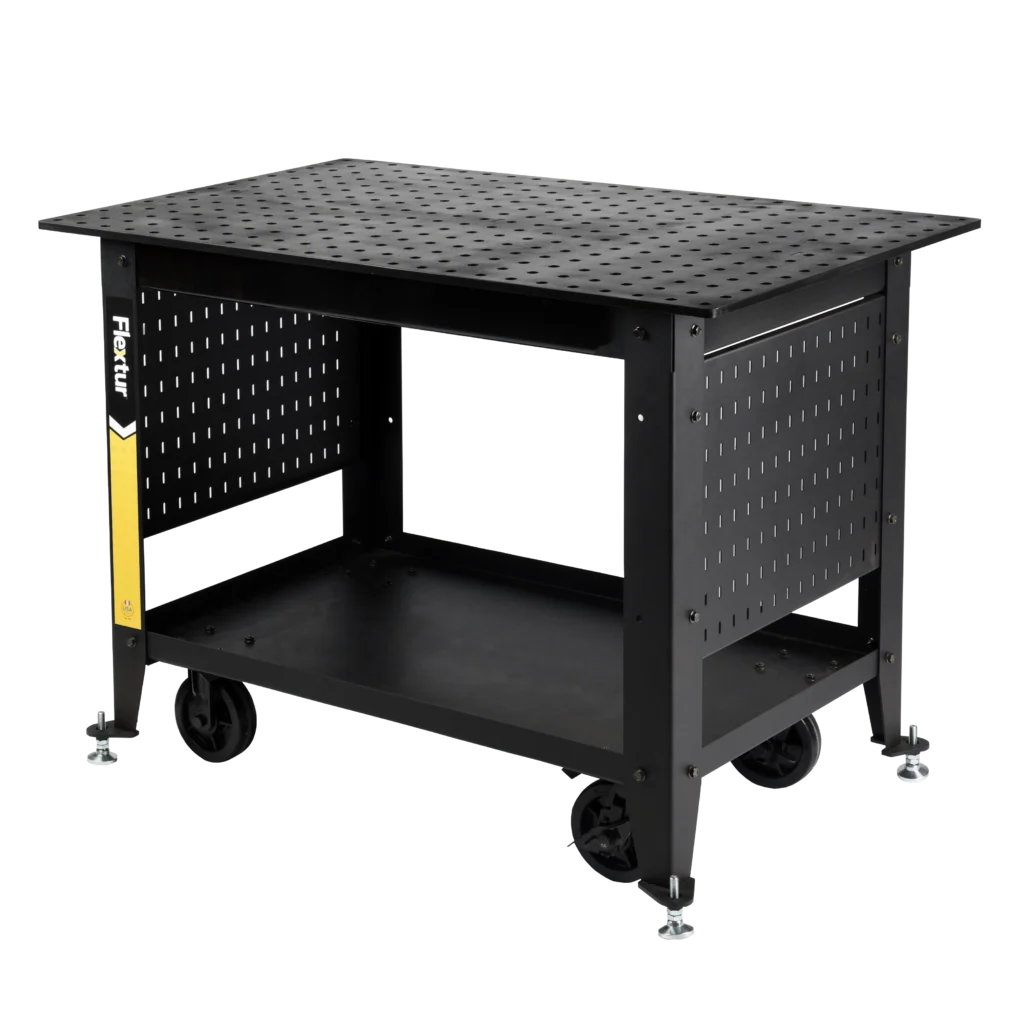 Flextur™ Mobile Nitride Welding Table Cart is capable of supporting and transporting 1,750lbs. This Mobile Welding Cart is ideal for cobots or any on-the-go welding work cell. The dual-layer protection of nitride & black oxide is a powerful combination. Both harden and prevent corrosion, extending the life of your table – while maintaining flatness and structural integrity. 14 gauge Flextur Tool Board capable of supporting 50lbs. on a single hook provide superior flexibility and strength when organizing tools and materials within easy reach. A full bottom shelf provides ample space for a welder or cobot controller. This robust and highly mobile solution is Flextur’s agile response to an industry need. American Made in Dalton, Ohio U.S.A.